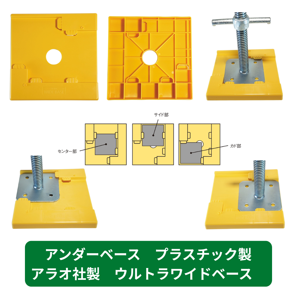 足場用のベース類で、樹脂製品のためリフォーム現場や内装現場など傷を付けたくない現場などでよく使用されています。